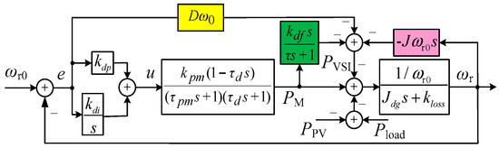 In order to evaluate the above analysis results, the control block diagrams of the simulation of an autonomous microgrid compensated with the VSG were built according to Figure 3 and Figure 4. The tests consist of a step increase in the power output of the PV generator, PPV, at t = 8 s from 0 kW to 10 kW, while the load power demand, Pload, remains constant at 15 kW. It should be noted that the PV production is connected to the microgrid by a PV inverter which is operating as a controlled current source. Then, a step increase in the power output of the PV generator can be achieved by regulating the PV inverter in this paper. In these conditions, the microgrid will operate at a high PV penetration level of 40%. The DGS parameters used in simulations are presented in Table 1. The suitable values of J and D can be determined by the (5) and (8) using the parameters listed in Table 1. Simulations are made for speed control without virtual inertia, J = 0, and with virtual inertia control, J = 0.32 kg·m2 and J = 0.64 kg·m2.