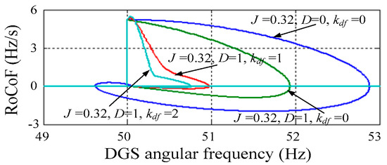 With Figure 10, the angular frequency-acceleration trajectories of simulated DGS are shown in Figure 11. It is obvious that the MFD and the RoCoF are mitigated more effectively for J = 0.32 kg·m2, D = 1, kdf = 2 than for J = 0.32 kg·m2, D = 1, kdf = 1, or for J = 0.32 kg·m2, D = 1, kdf = 0, or for J = 0.32 kg·m2, D = 0, kdf = 0. It implies that the proposed VSG with the differential feedforward control loop is more effective in enhancing the system frequency stability than the VSG without the differential feedforward control loop.