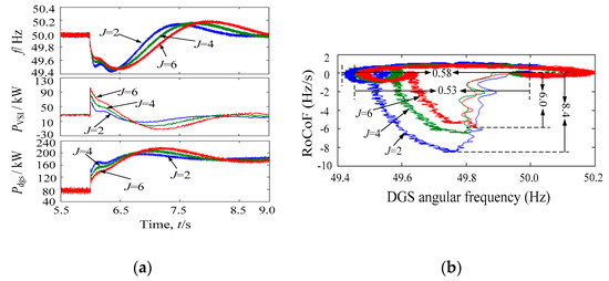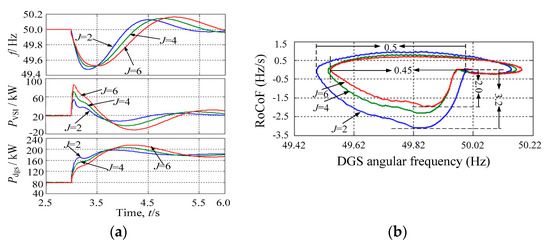 (1) Virtual inertia: The performance of increasing virtual inertia is shown in Figure 17a, where it can be found that the system frequency oscillates for a longer time. When the dynamic frequency support is complemented by the virtual inertia control loop (with J = 2 kg·m2, J = 4 kg·m2, and J = 6 kg·m2), the VSG outputs dynamic active power. As a result, both the MFD and the RoCoF are decreased, as shown in Figure 17b. For J = 6 kg·m2, the MFD is decreased from 0.58 Hz to 0.53 Hz, and the maximum RoCoF is decreased from 8.4 Hz/s to 6.0 Hz/s.
