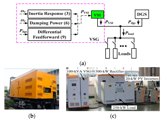 Experimental platform. (a) An autonomous microgrid with a DGS and a VSG unit; (b) A 400 kW DGS; (c) The VSG system.
