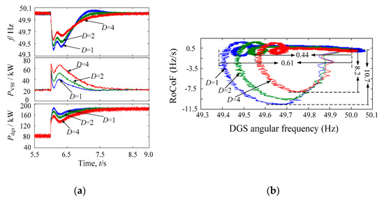 When the dynamic frequency support is complemented by the virtual damping control loop (with D = 1, D = 2, and D = 4), the VSG outputs dynamic active power. As a result, both the MFD and the RoCoF are decreased, as shown in Figure 18b. For D = 4, the MFD is decreased from 0.61 Hz to 0.44 Hz, and the maximum RoCoF is decreased from 10.7 Hz/s to 8.2 Hz/s.