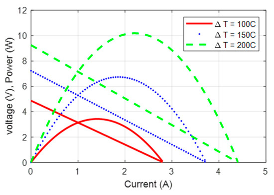 A PV module’s I-V characteristics are not linear, while in the case of the TEG, linearity governs the relationship between the voltage and current. The optimum operating point is related to the characteristics of the TEG module, as follows: