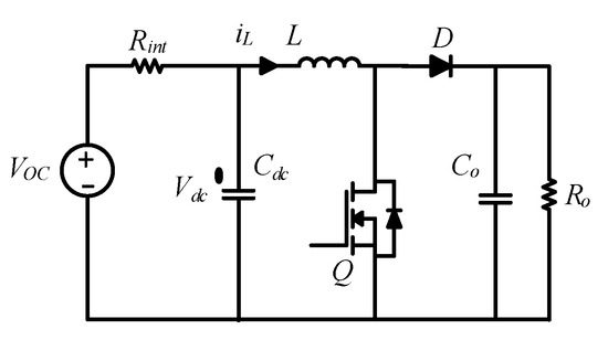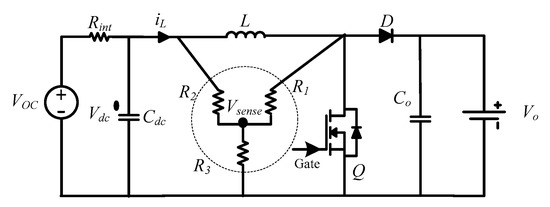 Figure 5 shows the schematic diagram of the boost converter under consideration. The output load in this case is a battery. The MPPT algorithm requires the collection of the power production information through the measurements of the input current and voltage. Moreover, the control objective of the MPPT algorithm is to tune the input voltage or current to its optimum point through dual control loops. While the input voltage is being measured and used in the control loops and MPPT algorithm, continuous monitoring of the output voltage is required to shift the controller from MPPT control to load matching (voltage mode control) in the case that the battery approaches its full charge (light load conditions). In the case where the converter is supplying a dynamic load instead of the battery, then control of the dc bus is needed, and in all cases, the output voltage information is needed to complete the cycle of the controller. The collection of the output voltage information is not intended in this paper to be used for the previously proposed MPPT algorithm, rather it is can be used to further control and monitor the load side, irrespective of load type.
