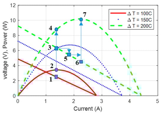During sharp transients in the open circuit voltage of the TEG due to sudden temperature variation across the structure, first: the reference current to the boost converter is kept constant and it is not changed by the MPPT algorithm. This is represented by points 1–4 in Figure 3. Point 1 is the optimum current command point for the TEG converter at . When there is a sharp transient in the temperature gradient, the operating point over the power curve moves directly from point 2 to point 4, where the current is still fixed at point 1, which is the same as point 3. The circuit waits until it settles to the new voltage level at point 3. This operating point is recorded as . A shift in the current command with suitable step size is then executed (e.g., ) to push the operating point to point 5 in the I–V characteristics line. This step size depends on the system’s size and the TEG characteristics. The converter responds by regulating to the new current level at point 5, which will change the voltage at the output of the TEG to a new value (). This is another point that is recorded. The linear characteristics of the TEG enable the construction of a straight line equation using two points (3 and 5) along its path, which are . From these two points, the straight-line equation is formed, and the middle point (point 6) is determined by setting either the current or the voltage in the equation to zero. In this case, two points of operation is sufficient to measure both or . Ultimately, point 7 can be reached from point 3 in only two steps.