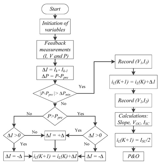 A flow chart for the proposed MPPT algorithm is shown in Figure 4. First, the variables are measured and and are calculated. If is less than a certain threshold, then it is concluded that the system is to run in the P&O mode, where incremental changes in power levels are small due to fine steps in the current command. If there is a sudden change in the open circuit voltage, due to sharp transients in the temperature gradient, large power increment is detected, and thus, the algorithm is operated in the transient mode. In this operating mode, the voltage and current readings of the last P&O step are recorded (i.e., before the algorithm moves to the transient mode). Then, the current is incremented by a sufficient magnitude to obtain distinct readings for the voltage and current to establish the other point needed to construct the line characteristics for the TEG. The estimated relation is then used to find and . If the converter is current controlled, then the optimum current command would be , which guarantees moving the operating point directly to the new MPP. Next, the system moves back to the normal P&O mode of operation.