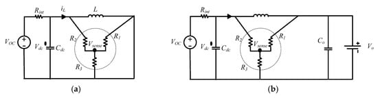 To derive the relation between and the input and output voltages’ information, the converter is analyzed during the ON and OFF times of the switch, as shown in Figure 6.