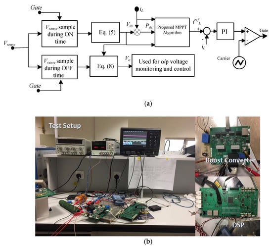 An in-lab hardware prototype was built and tested to verify the proposed algorithms. A boost converter built with components’ parameters shown in Table 1. The sensing resistors, as shown in Figure 7, were selected to be each. A TMS320F28335 DSP processor is utilized to build and execute the proposed algorithms. The input source is a DC voltage source in series with a resistor to simulate the behavior of a TEG module. The power level of the input source can be tuned to represent a single TEG module or a complete set of TEG modules.