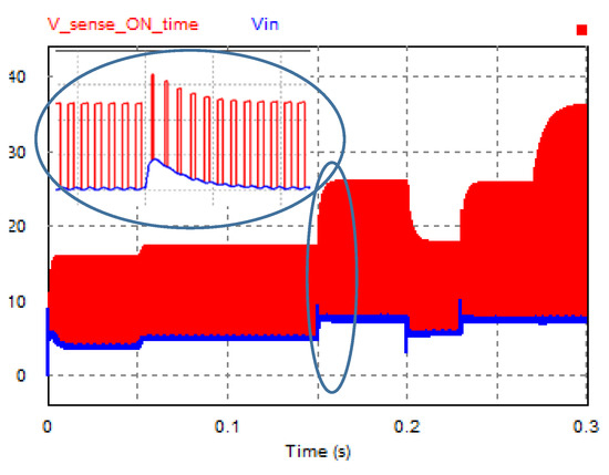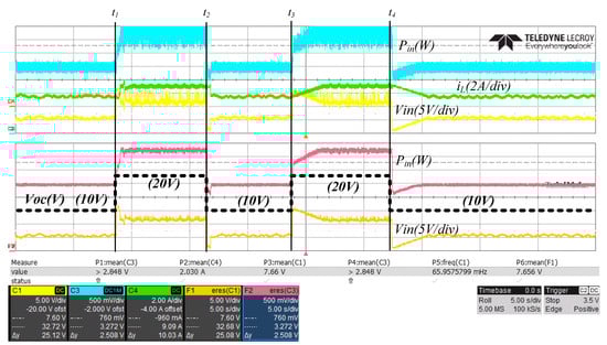 The proposed voltage sensing technique was implemented and tested using the exact same setup used for the MPPT algorithm verification. The sensed voltage and the reconstructed input and output voltages are shown in Figure 13. The sensed voltage is factorized using (5) and (8), as shown in Figure 7, to reconstruct the input and output voltages. Excellent matching to the derivation and simulation can be seen. In Figure 13, the traces are configured to better see the close behavior of the sensed voltage as compared to the input and output voltages. As shown in the figure, is a switched waveform that resembles Equations (5) and (8). Noting that does not coincide with either or , but the traces in the figure are configured to show the interrelation between the variables.