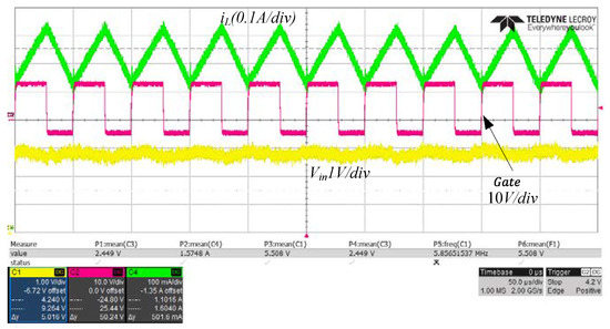 Experimental waveforms for the current, PWM signal, and input voltage of the operating boost converter.