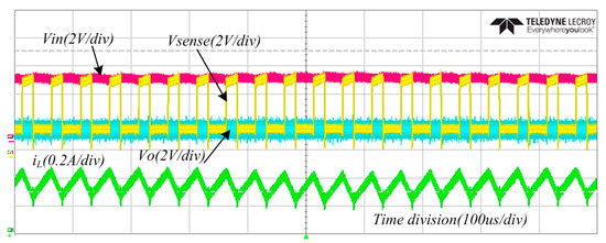 Experimental waveforms for the current, estimated input and output voltages, and the sensed voltage, as highlighted in Figure 5.