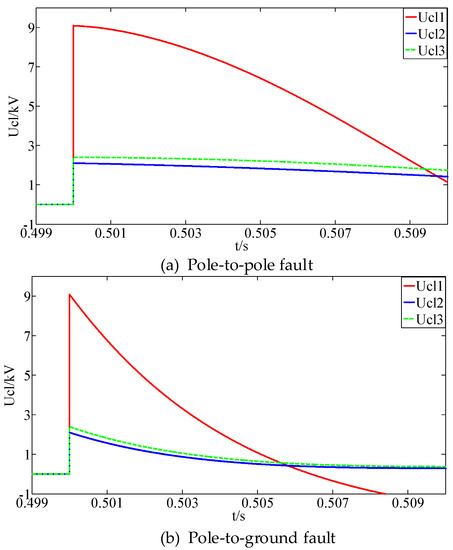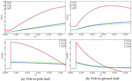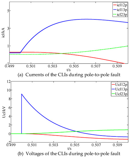As shown in (7)–(9), after the pole-to-ground fault, the voltage change rate of the CLI on the faulty line reaches a maximum value quickly and then attenuates gradually, which is similar to that of the pole-to-pole fault. The simulation results of the currents and voltages of the CLIs during the pole-to-pole fault and pole-to-ground fault are shown in Figure 2.