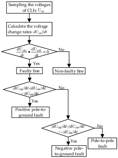 where, is the fault poles identification threshold. When the difference between the voltage change rates of the positive-pole and negative-pole CLIs is higher than the threshold, the positive-pole is the fault pole. When this difference is negative and less than the threshold, a negative pole-to-ground fault is determined.