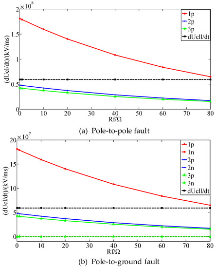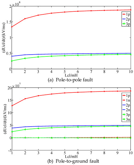 The pole-to-pole fault and pole-to-ground fault are applied at the system respectively. In addition, the current-limiting inductance varies from 1 mH to 10 mH. The voltage change rates of the CLIs during the faults are shown in Figure 10.