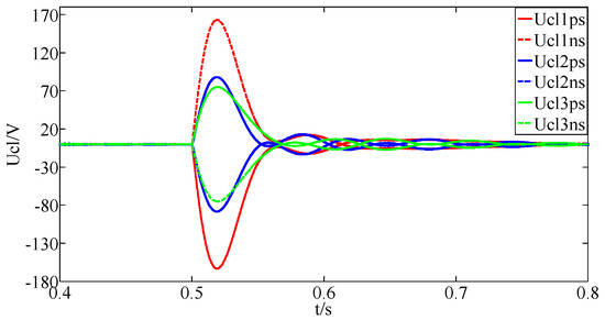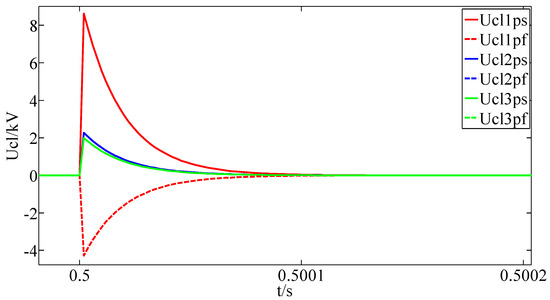 Table 2 shows that after the pole-to-pole and pole-to-ground faults, the voltage change rates of the CLIs on the faulty lines are higher than the faulty line identification threshold . In addition, the voltage change rates of the CLIs on the non-faulty lines are less than . The faulty lines can be identified correctly. For the pole-to-pole fault, the difference between voltage change rates of the positive pole and negative pole CLIs on the faulty line is 0, which is lower than the fault type determination threshold . Therefore, the pole-to-pole fault can be determined accurately. For the pole-to-ground fault, the fault type determination difference is higher than , so the fault type can be correctly identified. This difference satisfies the fault poles identification criteria at the same time. Therefore, it is determined to be a positive pole-to-ground fault.