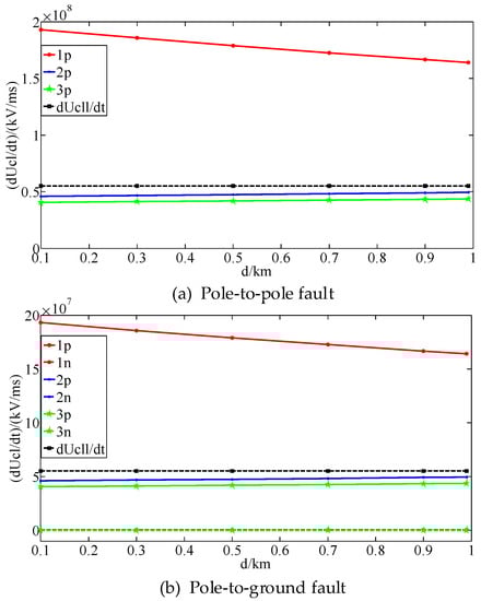 The pole-to-pole fault and pole-to-ground fault are applied at the system respectively. In addition, the fault distance varies from 0.1 km to 0.99 km. The voltage change rates of the CLIs during the faults are shown in Figure 9.