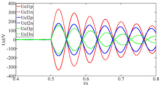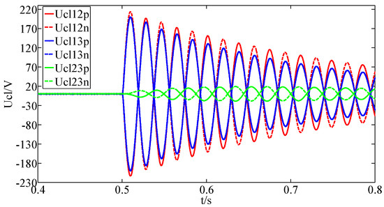 As shown in Figure 12, after a three-phase AC fault, the voltages of the CLIs increase rapidly and then attenuate gradually. The maximum amplitude of the voltage of the CLIs is less than 400 V, and the voltage change rates of the CLIs are much lower than that of the DC fault. Therefore, the AC fault does not affect the DC fault detection method proposed in this paper.