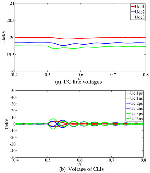 As shown in Figure 13, after a DC line voltage disturbance, the voltages of the DC lines changes and the voltages of the CLIs start to oscillate. However, the disturbance is small and the oscillation amplitudes of the voltages of the CLIs are less than 10 V, which has no influence on the results of the DC fault detection. Therefore, the proposed method keeps unaffected by the DC line voltage disturbance. Furthermore, the time of the DC fault ride-through is much longer than that of the fault detection [29,30]. Therefore, the influence of the voltage regulation and control on the fault detection method can be ignored and is not considered in this paper.
