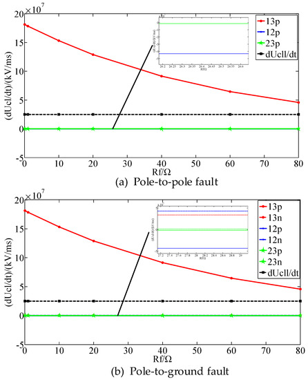 As shown in Figure 10, for the pole-to-pole and pole-to-ground faults, with the increase of the current-limiting inductances, the voltage change rates of the CLIs on the faulty line and non-faulty lines increase greatly at first and then rise slowly. The voltage change rates of the CLIs on the faulty line is always higher than the faulty line identification threshold. For non-faulty lines, the values are lower than the threshold. The difference of the voltage change rates between the positive-pole and negative-pole CLIs is relatively constant. The proposed faulty line identification, fault type determination, and fault poles identification criteria are always valid. Therefore, the proposed fault detection method can achieve fast and accurate detection of DC faults under different current-limiting inductances.
