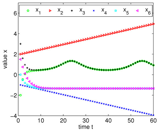 We assume that two highly connected nodes and are compromised, posing a severe threat to the system performance. Namely, and . The same scales, initial values, and weights for the system are taken as in Example 1. The state update rules for and are described by and , respectively. We perform the multiscale filtering strategy with parameter as per Theorem 1. As expected, we observe from Figure 5 that the desired multiscale consensus is finally reached in spite of the interference of these two well-connected faulty agents.