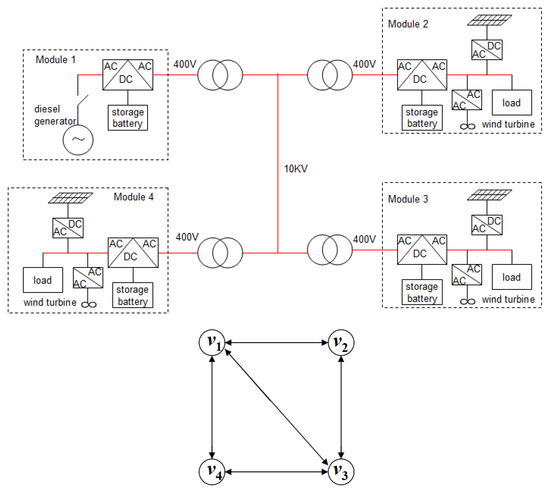 In this example, we adopt our multiscale consensus theory to realize the power and capacity consensus of battery storage based upon a project located on DongAo Island in China [26]. The traditional power system on islands takes the form of diesel generators which often cause some air pollution and noises. To overcome these drawbacks and improve networking, some stand-alone modular microgrids based on decentralized batteries have been proposed, which essentially entail distributed power and capacity consensus control protocols. The structure of the battery storage system on DongAo Island can be abstracted as an undirected network on four modules, with each agent representing a module; see Figure 6. This network has a -robust architecture.