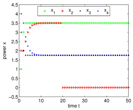 The initial values (battery power) of the four agents are taken as , , , , and the scales are chosen to be , . Let . We assume that module 2 failed due to some technical error at time , namely, for . We plot the power versus time in Figure 7 by using the multiscale formation generation scheme (6) and the multiscale filtering-formation strategy with parameter 1. The results in Figure 7 agree with Corollary 2. The remaining three functional modules (, , and ) managed to achieve the desired multiscale formation and hence the consensus reaching process is robust against adversarial events.