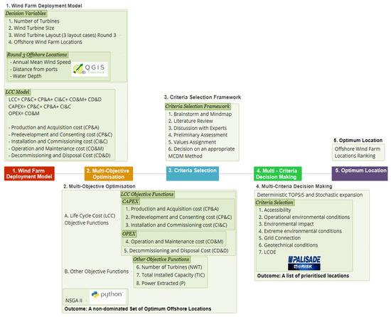 The aim of this paper is to develop a wind farm deployment framework, as illustrated in Figure 1, for supporting investment decisions at the initial stages of the development of Round 3 offshore wind farms in the UK by combining multi-objective optimization (MOO), life cycle cost (LCC) analysis and multicriteria decision making (MCDM). The contribution to knowledge is in developing and applying this novel and transferable framework that combines an economic analysis model by using LCC and geospatial analysis, MOO by using nondominated sorting genetic algorithm (NSGA II), survey data from real-world experts and finally MCDM by using a deterministic version and a stochastic expansion of the technique for the order of preference by similarity to the ideal solution (TOPSIS). Also, a criteria selection framework for the implementation of MCDM methods has been devised. The outcomes are expected to provide a deeper insight into the wind energy sector for future investments.