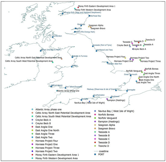 For the distances from the ports calculation an open source licensed geographic information system (GIS) called QGIS was used, which is a part of the Open Source Geospatial Foundation (OSGeo) [47]. A list of ports was acquired from [48,49,50]. The QGIS maps of the offshore sites were acquired from the official Crown Estate website [51] for QGIS and AutoCAD. The list contains designated, appropriate and sufficient construction ports that are suitable for the installation, manufacturing and maintenance for wind farms. New ports are to be built specifically to accommodate needs of the offshore wind industry; however, this study takes into account a selection of currently available ports around the UK. The distances were calculated assuming that the nearest port to the individual wind farm is connected in a straight line. QGIS was also employed to measure and model aspects of the LCC related to the geography and operations. The estimated metrics were integrated into the configuration settings of the whole LCC.