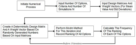 The approach proposed here for the stochastic expansion of deterministic methods was based in [26] that has reported the expansion of different deterministic methods, under the consideration that input variables are modelled as statistical distributions (derived by fitting data collected for each value in the decision matrix and weight vector), as shown in Figure 3. By using Monte Carlo simulations, numerous iterations quantify results and identify the number of cases where the optimum solution will prevail, i.e., there is a Pi probability that option Xi will rank first.