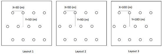 Demonstrating different layouts, where D corresponds to the diameter of the turbine.
