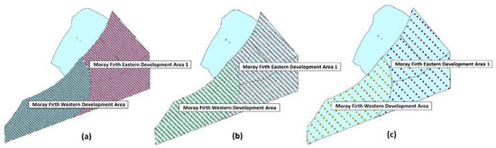 Moray Firth zone. A maximum number of wind turbines placed according to layout 1, layout 2 and layout 3 for the case of 10 MW turbine. In (a) Moray Firth, 10 MW turbines positioned in layout 1; (b) Moray Firth, 10 MW turbines positioned in layout 2; (c) Moray Firth, 10 MW turbines positioned in layout 3.