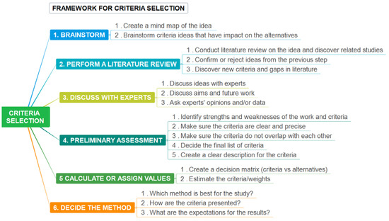 For the MCDA, the criteria selection process follows the process illustrated in Figure 7:
