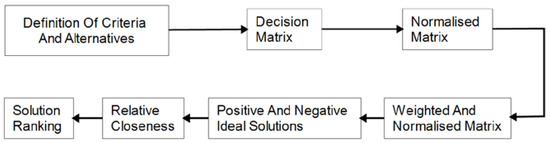 TOPSIS is depicted in Figure 8, initially proposed by Hwang et al. [55], and the idea behind it lies in the optimal alternative being as close in the distance as possible from an ideal solution and at the same time as far away as possible from a corresponding negative ideal solution. Both solutions are hypothetical and are derived from the method. The concept of closeness was later established and led to the actual growth of the TOPSIS theory [56,57].