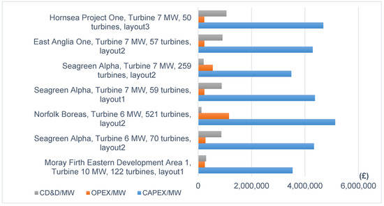 The data obtained from the experts were analysed and used in MCDM both deterministically and stochastically. The results from all locations (from all five zones) are provided and illustrated in Figure 9 as cost breakdown analysis. All 7 solutions shown and discussed were obtained from the execution of the NSGA II, and they are equally optimal solutions, according to the Pareto equality. The problem considered all 18 sites from the five selected Round 3 zones and the optimum results minimize CAPEX, OPEX and CD&D, as shown in Figure 9. At the same time, the remaining objectives are also optimized. All layouts were found to deliver optimal solutions, where layout 3 was found only once with few turbines.
