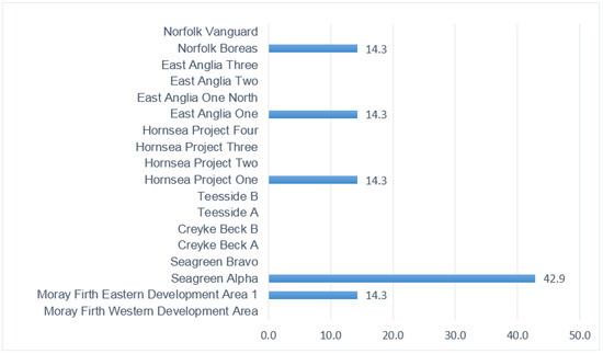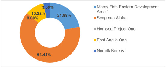 The results of both variations of TOPSIS are listed in Table 9. By implementation, the stochastic variation reveals more quantitative information about the alternatives and assigns the probability that an option will rank first, as shown in Figure 11. According to stochastic TOPSIS, the alternative that involves Seagreen Alpha was the most probable solution, followed by Moray Firth Eastern Development Area 1. Also, the former is three times more probable to be selected compared to the latter. The probability of other options to be selected is significantly lower, and Hornsea Project One is unlikely to be selected.
