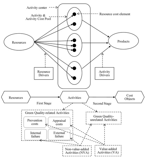 Green Quality Management mainly aims at eco-efficiency in the complete product life cycle, including design, raw material selection, process improvement, prevention and treatment of pollution, after-sales services and waste recycling, and processing. Quality cost measurement is the first step of quality cost management. Several researchers have proposed various methods to measure the cost of quality (COQ), which includes prevention, appraisal, internal failure, and external failure costs [4]. The Activity-Based Costing (ABC) approach has been widely used in measuring COQ [5,6,7,8,9] because many COQ elements are activity-related costs [9]. ABC uses a two-stage cost assignment to compute the costs of activities in the first stage and the costs of the objects in the second stage [10]. Thus, activity costs can be achieved in the first stage and sources of activity costs can be traced in the second stage of ABC cost assignment. ABC divides activities into value-added (VA) and non-value-added (NVA) activities. The purpose of green quality management is to reduce the workload of VA activities and to finally eliminate the execution of NVA activities related to COQ.