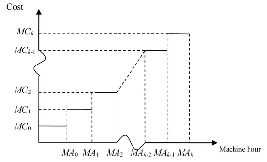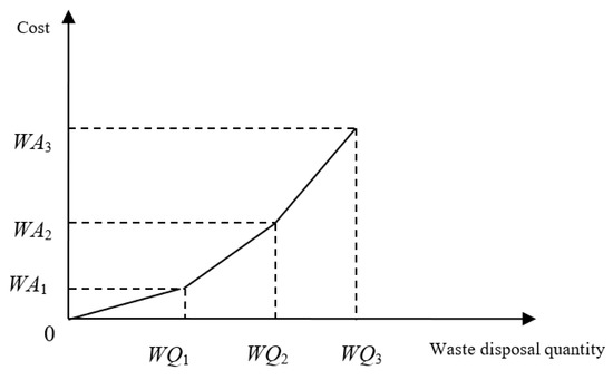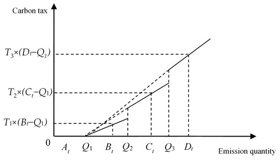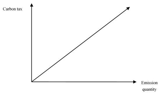 This study intended to explore the effects of carbon tax levies on production mix decisions. Figure 3 is the carbon tax function with a fixed tax rate, which has been adopted by many countries presently. However, if the carbon tax level is too low, companies may want to pay the tax and continue to pollute. Thus, the government may use carbon tax functions that have a full progressive tax rate without a threshold (Figure 4) [50] or with a threshold (Figure 5). In these two carbon tax functions, the higher a company’s carbon emission quantity, the higher the carbon tax rate. It will have aggressive effect on carbon emission reduction. However, considering small companies with very low levels of production and high levels of carbon pollution, the government may use the carbon tax system with a threshold, as shown in Figure 5, where a company will have a carbon tax exemption when its carbon emission quantity is under threshold quantity [51]. In this paper, a carbon tax system with progressive tax rates and a threshold was used for illustration. On the other hand, the government should help companies reduce carbon emissions by providing subsidies for carbon emission control equipment or other methods. A carbon tax can be a regressive tax, in that it may directly or indirectly affect low-income groups disproportionately [41]. The latter allows for different rates at different carbon levels and can still create a meaningful impact in carbon reduction [52].