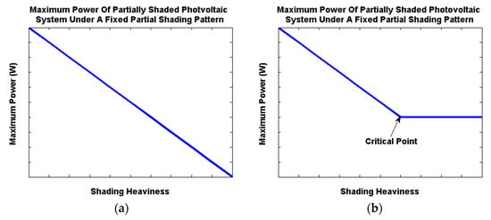26] suggested that under an identical partial shading pattern, the maximum power of a photovoltaic system should drop at a constant rate as the shading heaviness increases, as illustrated in