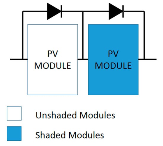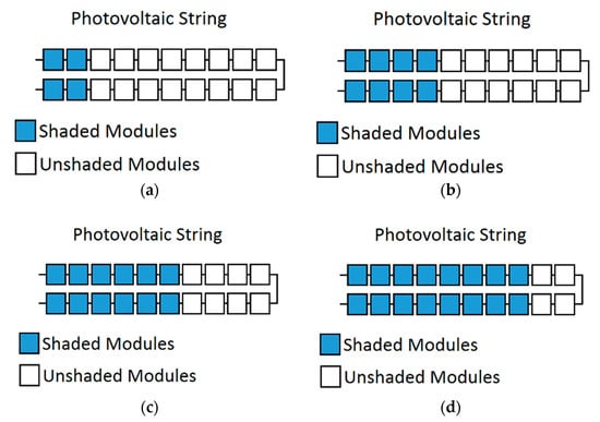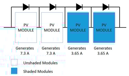 Figure 14. The photovoltaic string consists of four photovoltaic modules where two photovoltaic modules are unshaded and the other two photovoltaic modules are shaded, as illustrated in