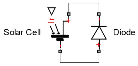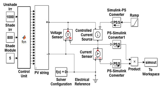 The short circuit current, open circuit voltage, series resistance, and ideality factor of the solar cell block are set according to the experiment requirements. To implement the bypass diode, the diode block from the Simscape block set is connected in antiparallel with the solar cell block, as shown in