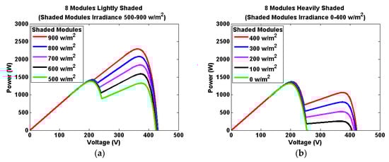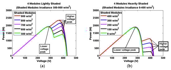 Figure 8b illustrates the P-V characteristics when the shaded modules irradiance is between 0 and 400 w/m