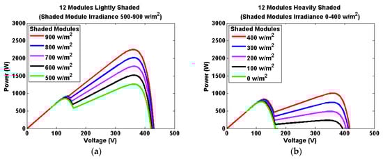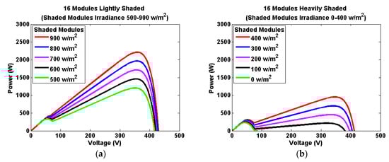 Figure 4a. It means that under an identical partial shading pattern, a partially shaded photovoltaic system is always susceptible to the shading heaviness. This makes sense as the photovoltaic system relies on the solar irradiance to generate electrical power, and the maximum power of a partially shaded photovoltaic system should be lower and lower as the shading heaviness is getting heavier and heavier.
