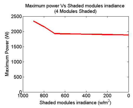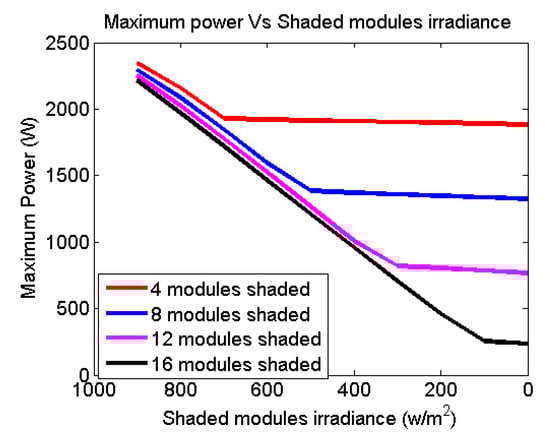2 drop in the shaded module irradiance. These results show that the maximum power is susceptible to the shading on the shaded modules when the shaded modules irradiance is above the critical point determined by Equation (3). The maximum power becomes insusceptible to the shading on the shaded modules when the shaded modules irradiance is below or equal to the critical point determined by Equation (3).