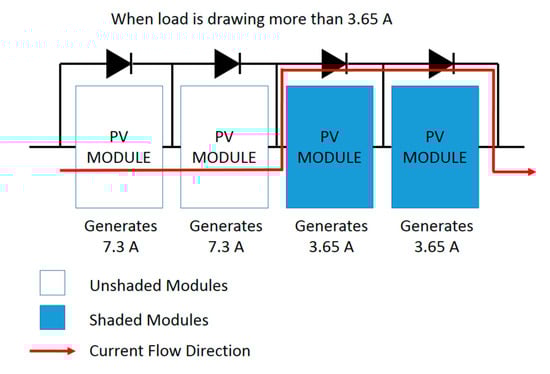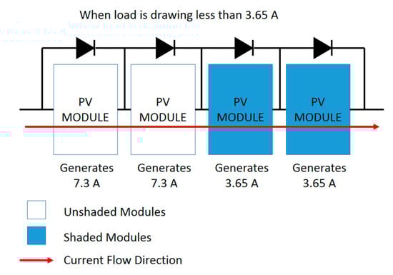When the load is drawing less than 3.65 A, the shaded photovoltaic modules are not bypassed by the bypass diodes. Hence, the current generated by the unshaded photovoltaic modules flow through the shaded photovoltaic modules, as illustrated in