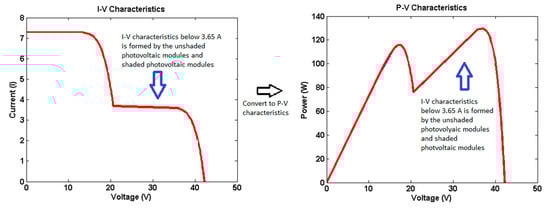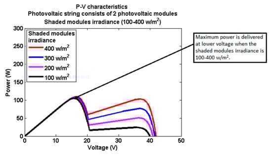 Figure 19. This proves that the higher voltage peak of the P-V characteristics is formed by the shaded and unshaded photovoltaic modules in the photovoltaic string. Hence, the higher voltage peak is susceptible to the shading on the shaded photovoltaic modules. On the other hand, the lower voltage peak is formed by the unshaded photovoltaic modules only, as concluded in