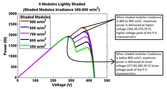 Figure 22. The simulation results show that the maximum power is delivered at a lower voltage when the shaded module irradiance is below or equal to the critical point of 400 w/m