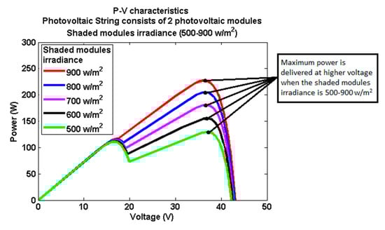Regardless of the number of shaded modules in the photovoltaic string, the higher voltage peak of the P-V characteristics reduces significantly as the shaded modules irradiance decreases. On the other hand, the lower voltage peak rarely changes as the shaded modules irradiance decreases. This is because the higher voltage peak of the P-V characteristics is formed by the shaded and unshaded photovoltaic modules in the photovoltaic string. Hence, the higher voltage peak is susceptible to the shading that is applied to the shaded photovoltaic modules. On the other hand, the lower voltage peak is formed by the unshaded modules in the photovoltaic string. Hence, the lower voltage peak is insusceptible to the shading applied to the shaded photovoltaic modules.