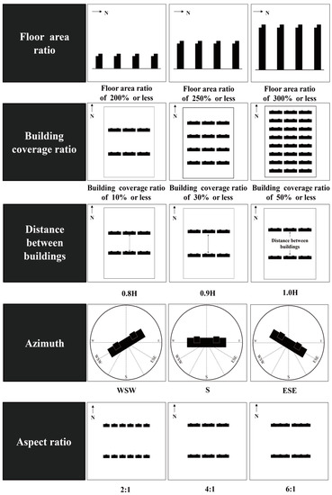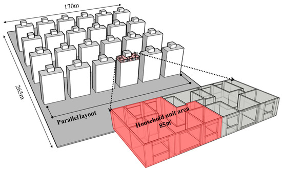 Figure 4 shows the basic model of the case study. The land area is 265 m × 170 m, and residential buildings were planned to have a parallel layout. Furthermore, residential buildings were assumed to be plate type and each household unit area was set to 85 m2 or less, which is the national housing size. The height of each household was set as 2.9 m.