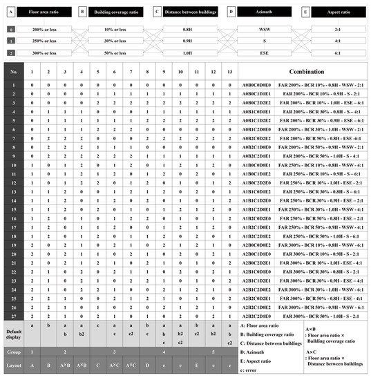 This study considers an existing paper that selected valid cases using the orthogonal matrix L27(313) for the design of experiments [56]. To create a comfortable living environment using these cases, the two environmental factors of natural lighting and microclimate were selected and a method that can satisfy both of these factors was investigated in this study. Figure 1 shows a matrix that represents the method to secure natural lighting and improve the outdoor microclimate.