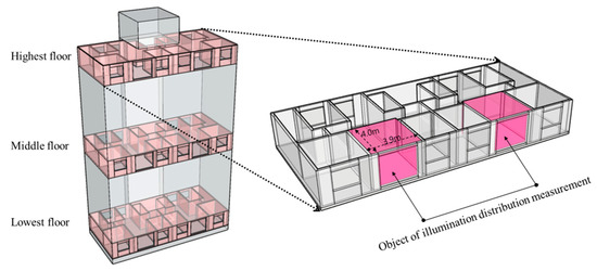 Figure 5 shows measurement objects for natural lighting simulation. For natural lighting analysis, the living rooms of each household in the lowest, middle, and highest floors of the residential building were selected. The measured area of each household is 4.0 m × 3.9 m, the cell size is 0.5 m, and the number of measurement points is 72. The measurement height for natural lighting is 0.7 m above the floor. The properties of the building materials used for natural lighting simulations are shown in Table 3. The percentages of natural lighting under CIE cloudy sky conditions were measured. Table 4 shows some of the simulation parameters for Daysim, which define the light reflection, optical resolution, etc. [80]. The time of use was set as 08:00 to 18:00 h, and the minimum illuminance was set as 300 lux.