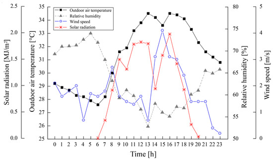 Table 5 lists the microclimate modeling simulation conditions. They were evaluated at 14:00 h on 5 August 2017 when the ambient temperature was high [81]. For meteorological data, the Automated Surface Observing System (ASOS) was used. Figure 6 is a depiction of outdoor air temperature (1.2–1.5 m from the surface), relative humidity, wind speed, and solar radiation, among the data collected on 5 August. The dimension of the simulation space was 85 m × 133 m × 52 m, and the grid size was 2 m. The material for the target surface was set as asphalt, and the material of the residential buildings was set as concrete. For the evaluation indices, the atmospheric temperature, mean radiant temperature (MRT), relative humidity, and wind speed were measured at 1.4 m height from the center of the target site. For the meteorological factors, the atmospheric temperature is denoted as Ta, the mean radiant temperature as Tmrt, the relative humidity as RH, and the wind speed as WS in this paper.